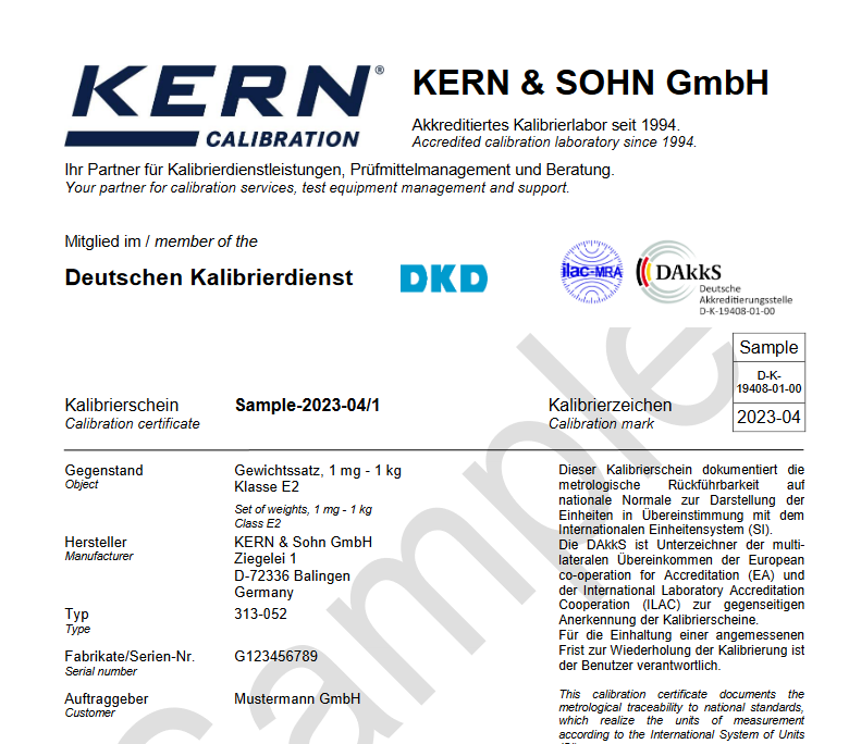 The KERN DAkkS calibration laboratory (D-K-19408-01-00) is accredited through the accreditation Point of the German calibration service. The DAkkS calibration certificate is recognised internationally and is available in several languages.